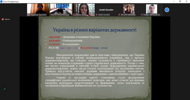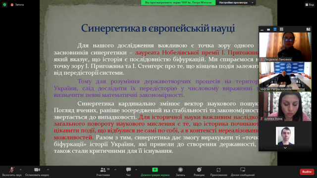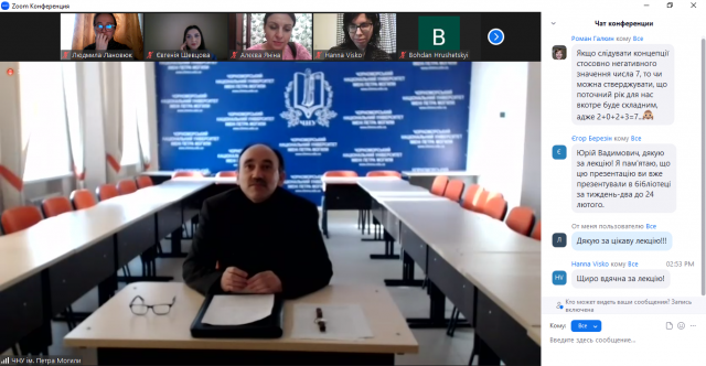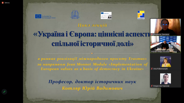 1 лютого 2023 р. професорсько-викладацький склад кафедри міжнародних відносин і суспільних наук разом зі студентами та аспірантами кафедри прослухали чергову відкриту онлайн-лекцію доктора історичних наук, професора Чорноморського Національного університету імені Петра Могили Юрія Котляра за темою «Синергетичний метод у дослідженні Українського державотворення: європейський досвід». Курс відкритих лекцій реалізується в межах міжнародного проєкту Erasmus+ за напрямком Jean Monnet Module «Implementation of European values as a basis of democracy in Ukraine».