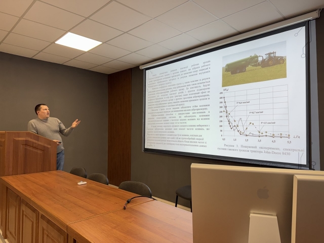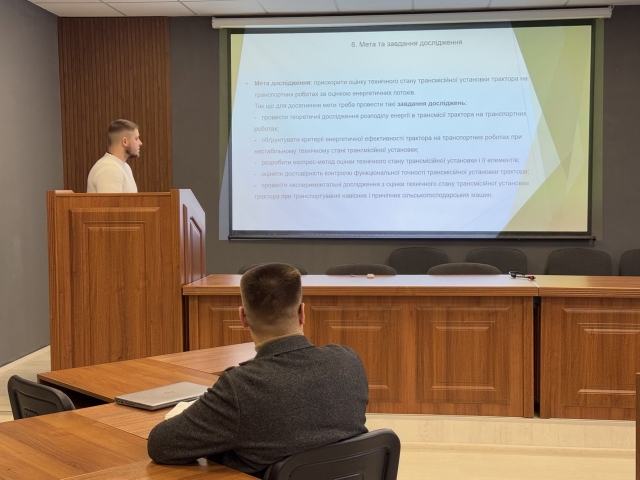Аспірант другого року навчання Станіслав КОСТЮК представив проміжний звіт про хід виконання своєї дисертаційної роботи, присвяченої підвищенню ефективності контролю технічного стану трансмісійної установки енергонасиченого трактора на транспортних операціях. У своєму виступі він детально проаналізував існуючі методи діагностики трансмісійних установок, представив результати власних експериментальних досліджень та обґрунтував доцільність використання запропонованих підходів. Особливу увагу аспірант приділив питанням оптимізації діагностичних процесів, що дозволяють знизити експлуатаційні витрати та підвищити надійність роботи техніки. Члени комісії відзначили значний прогрес у виконанні дослідження, наголосили на важливості подальшої роботи над математичним моделюванням процесів контролю технічного стану та запропонували розглянути можливість практичного застосування розроблених методик на базі реальних виробничих підприємств.