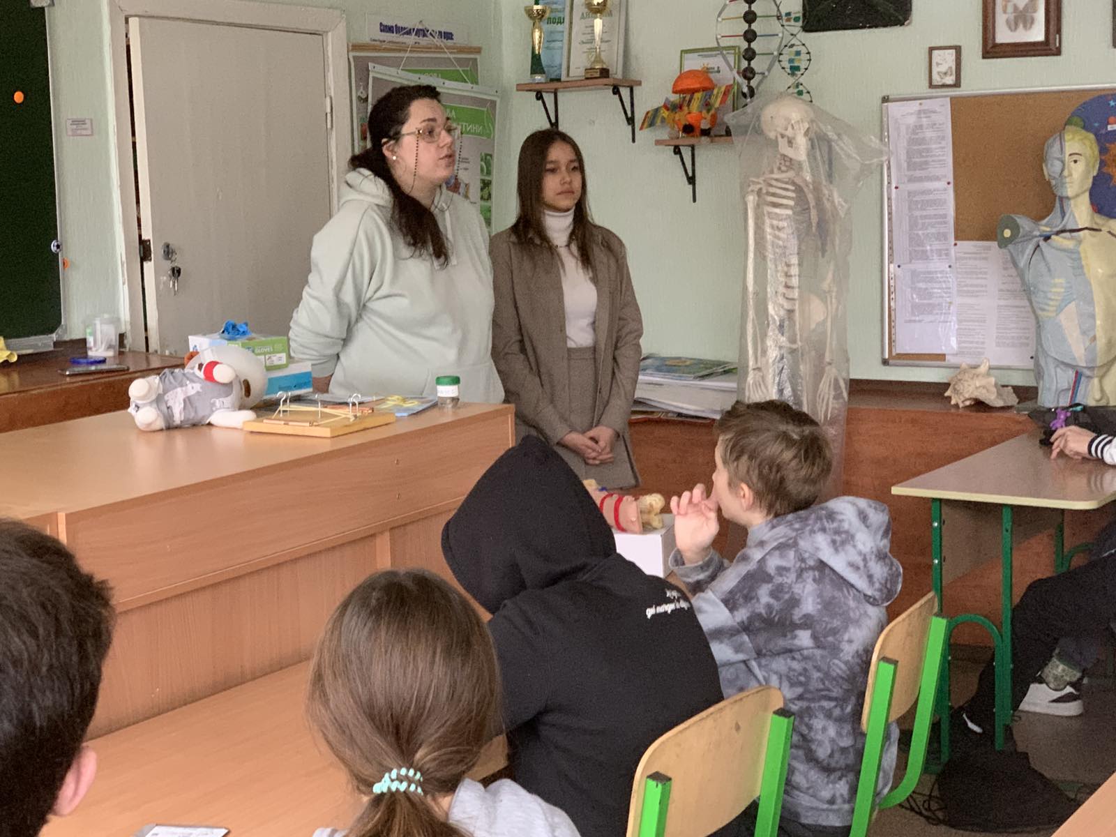 Асистент Ірина Горкава та студентка Мухіпова Ельміра ознайомили учнів ліцею № 227 Голосіївського району міста Києва із професією ветеринарного лікаря