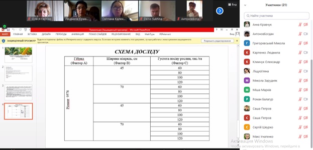 25-26 листопада 2021 року на випусковій кафедрі рослинництва агробіологічного факультету проведено атестацію магістрів 1-го року навчання згідно згідно «Положення про підготовку і захист кваліфікаційної магістерської роботи у Національному університеті біоресурсів і природокористування України» (посилання https://nubip.edu.ua/sites/default/files/u284/polozhennya_pro_napis._ma…). Студенти магістратури доповіли за темами своїх магістерських робіт, висвітлили актуальність обраних тем, мету та завдання, місце проведення та схему експериментальних досліджень, повідомили про стан виконання індивідуального навчального плану студента магістратури.