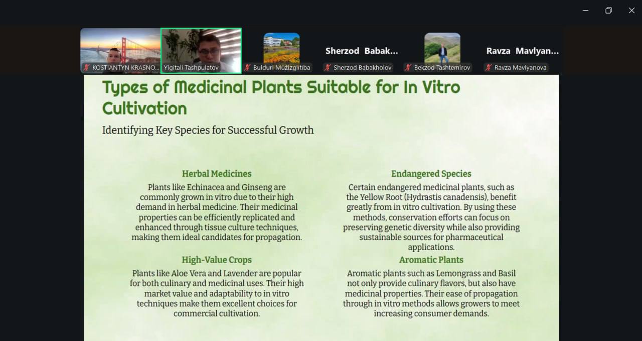 Другий день переніс фокус на новітні технології та практики, із залученням магістрів першого року навчання спеціальності «Охорона та технології відновлення ґрунтів». Завдяки нашим партнерам із Samarkand Agroinnovations and Research University та Research Institute of Vegetables, Melons and Potatoes учасники ознайомилися з актуальними темами: «Розумне та стале сільське господарство» (включно з політиками розвитку біоекономіки в Узбекистані), «Біотехнологія розмноження рослин» (методи мікроклонального розмноження та індукції мікробульб картоплі in vitro) та «Технології виробництва плодових та овочевих культур» (досвід вирощування полуниці, дині, бамії та батату в Узбекистані).