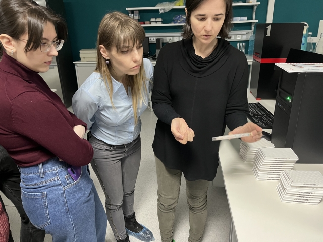 Першим етапом є скринінг біологічних властивостей нових потенційних речовин in vitro на культурах нормальних і пухлинних клітин різного походження. Майбутні біотехнологи ознайомилися з системами автоматичного дозування реагентів та клітинних суспензій. Слід зауважити, що лабораторія Bienta є однією з небагатьох європейських компаній, що повністю автоматизувала складні дослідження на культурах клітин, такі як визначення проникності речовини через клітинну мембрану та специфічні рецепторні канали. Студенти ознайомилися з роботизованими системами біологічних досліджень, зокрема, Opentrons (робот, що взагалі не потребує допомоги оператора під час виконання експерименту та здатен працювати з десятками речовин в одному досліді) та прибором для високоефективного скринінгу сигнальних шляхів в клітинах – FLIPR Tetra – системою, що за декілька секунд вимірює вплив досліджуваних речовин одночасно у 384 пробах. До уваги студентів був представлений скринінг потенційних сполук з інсектицидними властивостями та речовин-ймовірних добрив, які щодня у великій кількості аналізуються у лабораторіях Bienta.