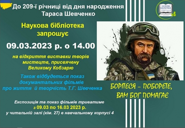9 березня 2023 р. о 14.00 в читальній залі наукової бібліотеки (навч. корпус №4, кім. 27) відбудеться відкриття експозиції творів мистецтва та показ документальних фільмів про Великого Кобзаря.