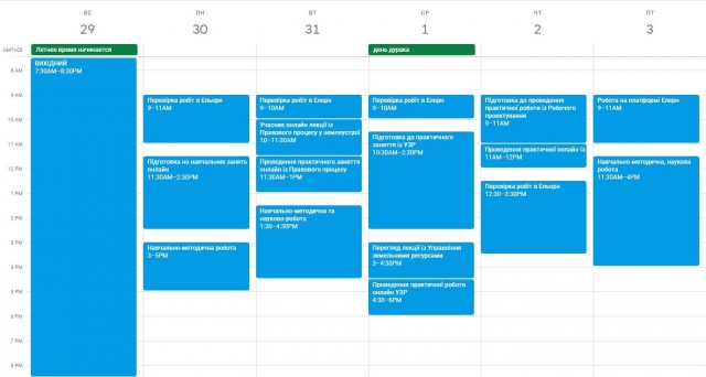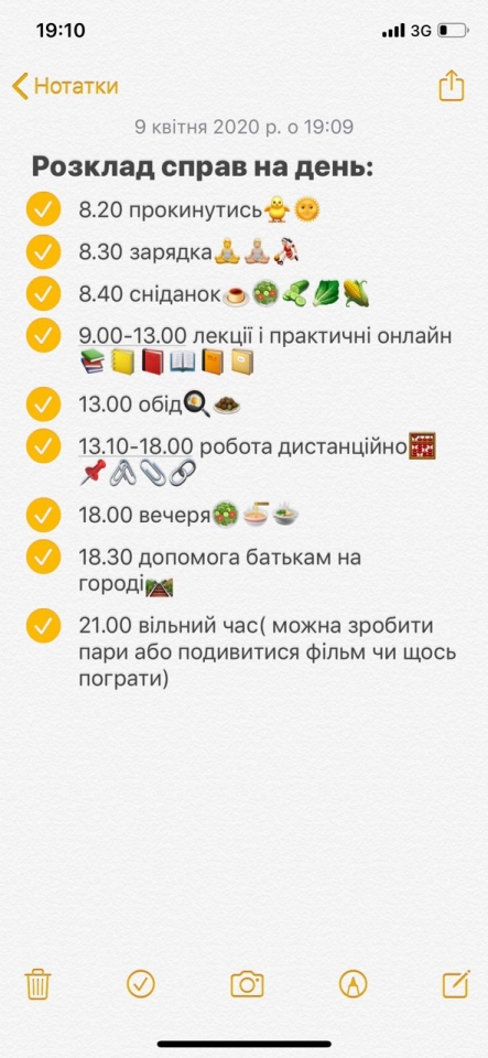У зв`язку із запровадженням карантину настаники академічних груп кафедри управління земельними ресурсами Бутенко Є.В., Колісник Г.М. запропонували студентам пройти цікавий челендж, а саме зробити й поділитись своїм розпорядком дня. Також наставники представили свой розпорядок. Так, виявилось що у студентів набагато різноманітніший він вийшов, адже у викладачів була представлена тільки їхня робота).