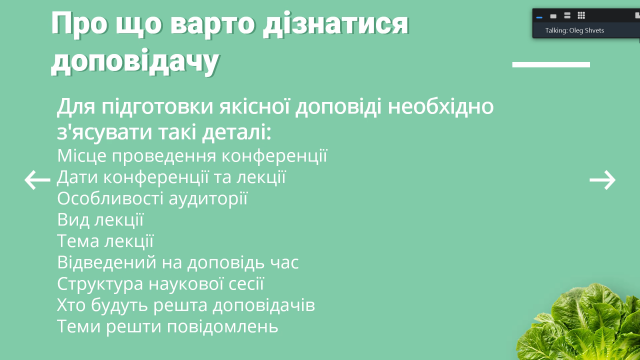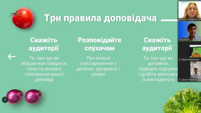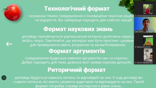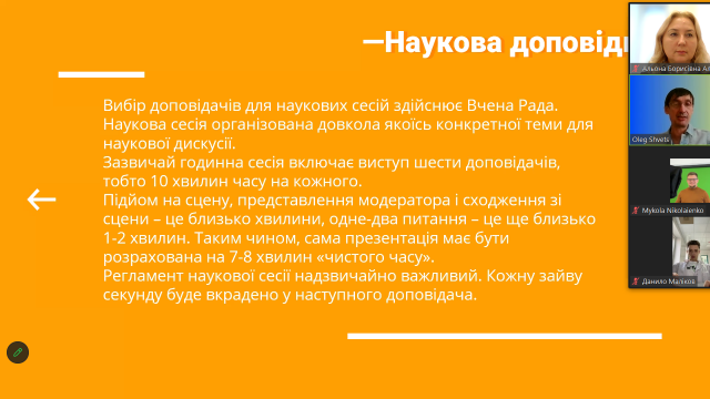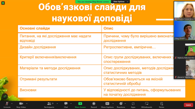 Тематика засідання передбачала рекомендації щодо створення доповідей та презентацій для висвітлення результатів дослідницької та наукової діяльності під час науково-практичних конференцій, семінарів, захисту бакалаврських та магістерських кваліфікаційних робіт тощо.