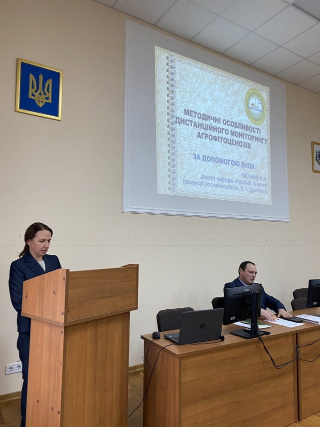 До уваги присутніх була представлена наукова доповідь на тему «Методичні особливості дистанційного моніторингу агрофітоценозів» кандидата с.-г. наук, доцента кафедри агрохімії та якості продукції ім. О.І Душечкіна Наталії Пасічник. Результати наукових досліджень визначені у полі і проаналізовані за допомогою інформаційних систем доповідача полягали у детальному аналізі дистанційних підходів щодо моніторингу посівів сільськогосподарських культур із залученням сенсорних систем в визначенні входження рослин у мікростадій, наявність забур’яненості посівів та представників рослин іншого сорту у польових умовах. Представлені дослідження викликали великий інтерес присутніх, до питань і обговорень долучились академік Анатолій Бикін, професор Анатолій Балаєв, доцент Анатолій Бобер, доктор с.-г. наук Юрій Кравченко. Виступаючи зазначили перспективність представлених досліджень і використання одержаних результатів у виробництві і навчальному процесі.