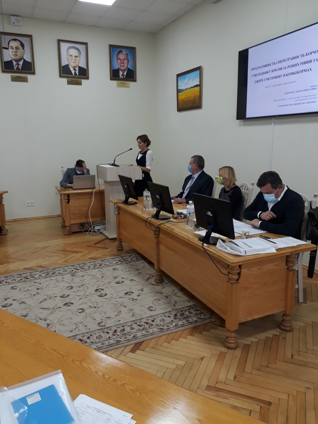 4 листопада 2020 року відбулося засідання спеціалізованої вченої ради Д 26.004.05 на якому проведено прилюдний захист дисертаційної роботи Андрієнко Любові Миколаївни на тему: «Продуктивність і перетравність корму у молодняку кролів за різних рівнів та джерел метіоніну в комбікормах», поданої на здобуття наукового ступеня кандидата сільськогосподарських наук за спеціальністю 06.02.02 – годівля тварин і технологія кормів. Науковий керівник доктор сільськогосподарських наук, професор, член-кореспондент НААН Отченашко Володимир Віталійович.