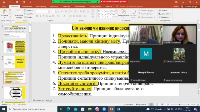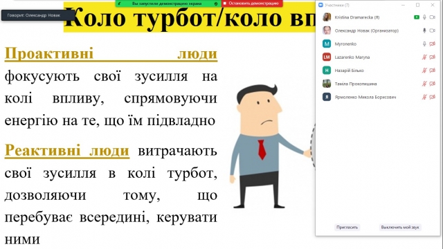 Гуртківці активно брали участь в обговоренні книги, висловлювали свою думку та розуміння 7 навичок надзвичайно ефективних людей від Стівена Кові. Учасники зустрічі дійшли спільного висновку, що праця «7 звичок надзвичайно ефективних людей» заслуговує уваги всіх читачів, адже вона про гармонійний розвиток людини, пошук сенсу життя і правильної реакції на обставини.