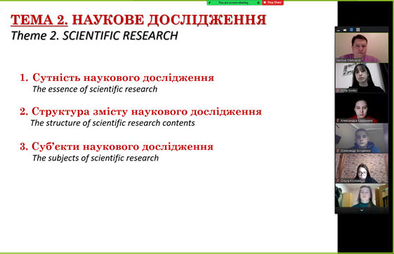 15 лютого 2022 р. на кафедрі адміністративного менеджменту та ЗЕД відбулась планова зустріч членів гуртка «Основи наукових досліджень в агробізнесі» із його керівником. Протягом наукової години к.е.н., доц. Олександр Файчук розповідав перспективній молоді про сутніть, структуру і суб’єктів наукового дослідження. Теоретичний матеріал, який лектор висвітлював студентам із використанням технічних засобів унаочнення інформації, він також вміло підсилював реальними прикладами задля кращого розуміння і засвоєння знань. Особливу увагу керівник гуртка звернув на те, як правильно обирати тему майбутнього наукового дослідження, визначати його об’єкт і предмет, формулювати гіпотезу, мету і завдання роботи. Наприкінці зустрічі члени гуртка задали Олександру Файчуку ряд запитань, що засвідчило їх інтерес та бажання проводити у майбутньому якісні наукові дослідження.