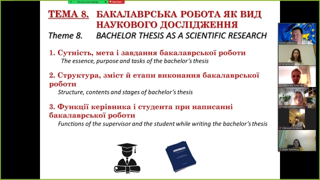 Протягом заняття Олександр Файчук фахово пояснив слухачам, у чому полягає сутність бакалаврської роботи, розкрив її мету та завдання. Особливу увагу було звернуто на структуру, зміст та алгоритм виконання дослідження. Науковий керівник не лише показав студентам характерні відмінності між основними розділами бакалаврської роботи, але й навчив їх правильно вибудовувати її архітектоніку, виходячи із причинно-наслідкових зв’язків між розділами. Разом із тим, члени гуртка отримали знання про те, як слід формулювати висновки на основі одержаних результатів наукового дослідження. Також Олександ Файчук проінформував студентів про розподіл основних функціональних обов’язків між науковим керівником і здобувачем в процесі підготовки до захисту випускної бакалаврської роботи.