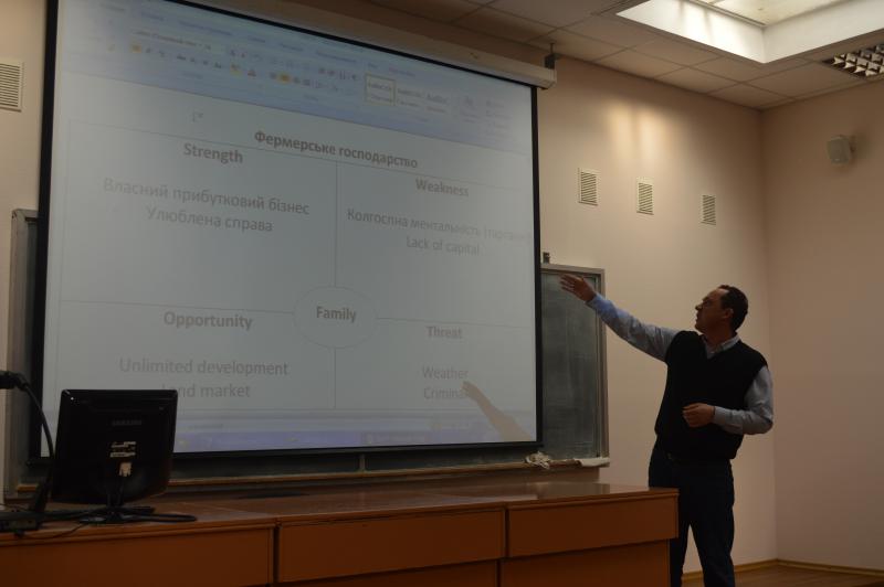 Пан Олександр розповідав про особливості функціонування ферми, свій шлях до успіху та перешкоди, які уже подолані та чекають на нього у майбутньому. Всю іформацію лектор подав у формі SWOT-аналізу, де детально розібрали сильні та слабкі сторони, можливості і загрози. До бесіди активно долучилися студенти, які висловлювали свою думку щодо ведення фермерського бізнесу, і, звичайно, ставили провокативні запитання, які найбільше їх хвилюють.