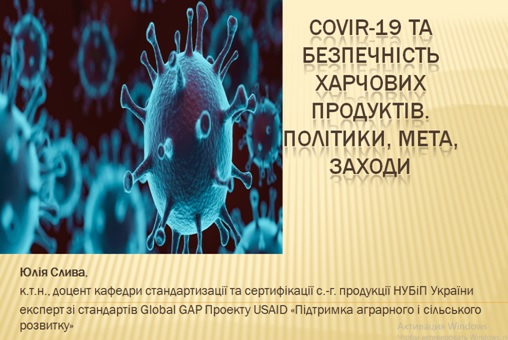 Під час вивчення дисципліни «Управління якістю та безпечністю с/г та харчової продукції» студенти вивчають сучасний стан регулювання питань якості, безпечності продукції, схеми та системи управління безпечністю продукції з врахуванням концепції «Від лану – до столу» та управління ланцюгами постачання продовольства. З врахуванням останніх подій та загроз щодо пандемії COVIR-19 була переглянута програма дисципліни та включена до вивчення тема «COVIR-19 та безпечність харчових продуктів. Політики, мета, заходи».
