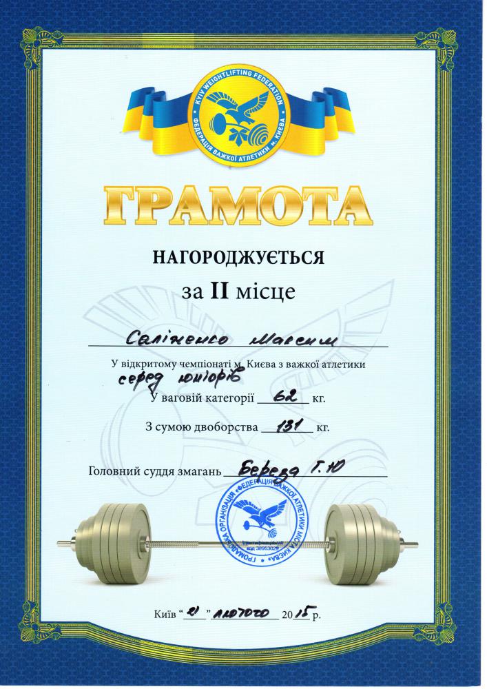 Вітаємо Саліженка Максима, студента 3 курсу факультету ветеринарної медицини, зі здобуттям срібної медалі на відкритому чемпіонаті м. Києва з важкої атлетики серед юніорів у ваговій категорії 62 кг з сумою двоборства у 131 кг, який відбувся 21.02.2015 року. Бажаємо Максиму творчої наснаги та нових спортивних досягнень.