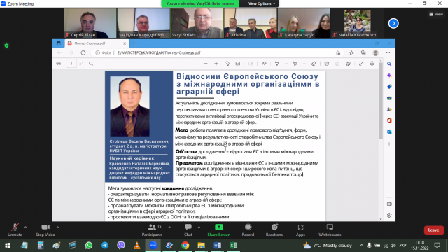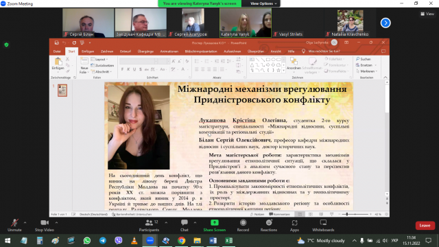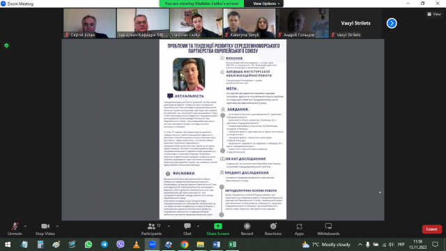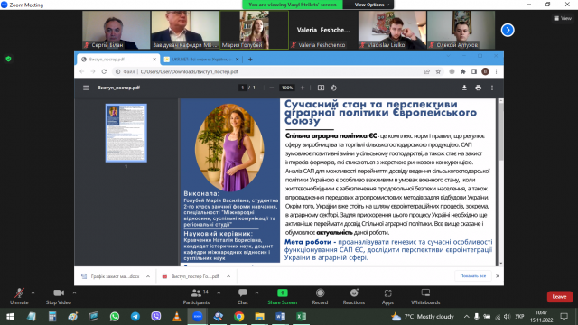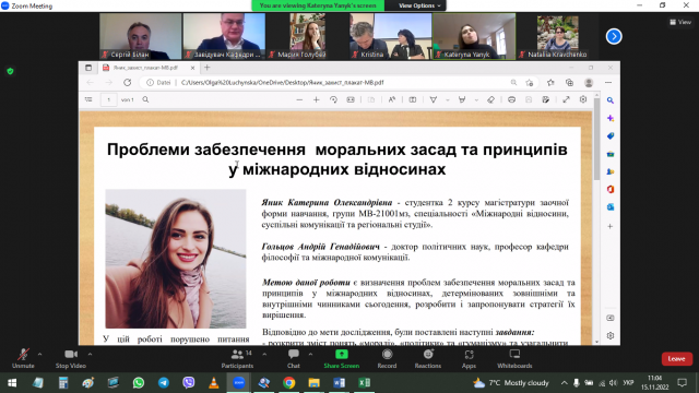 Магістри другого року навчання впевнено крокують до завершення ще одного етапу на своїй життєвій стежині. Наразі фінальною стадією став захист кваліфікаційних магістерських робіт. Студенти спеціальності «Міжнародні відносини, суспільні комунікації та регіональні студії» вдало дебютували, презентувавши результати свого наукового доробку шляхом публічного захисту. Враховуючи обставини, викликані аварійним та плановим відключенням електроенергії, перебоями мережі Інтернет та мобільного зв’язку було прийнято рішення провести захід у змішаному форматі (оф-лайн та он-лайн) з використанням платформи Zoom. Постерні презентації успішно продемонстрували 9 студентів заочної форми навчання та 12 студентів денної форми навчання.