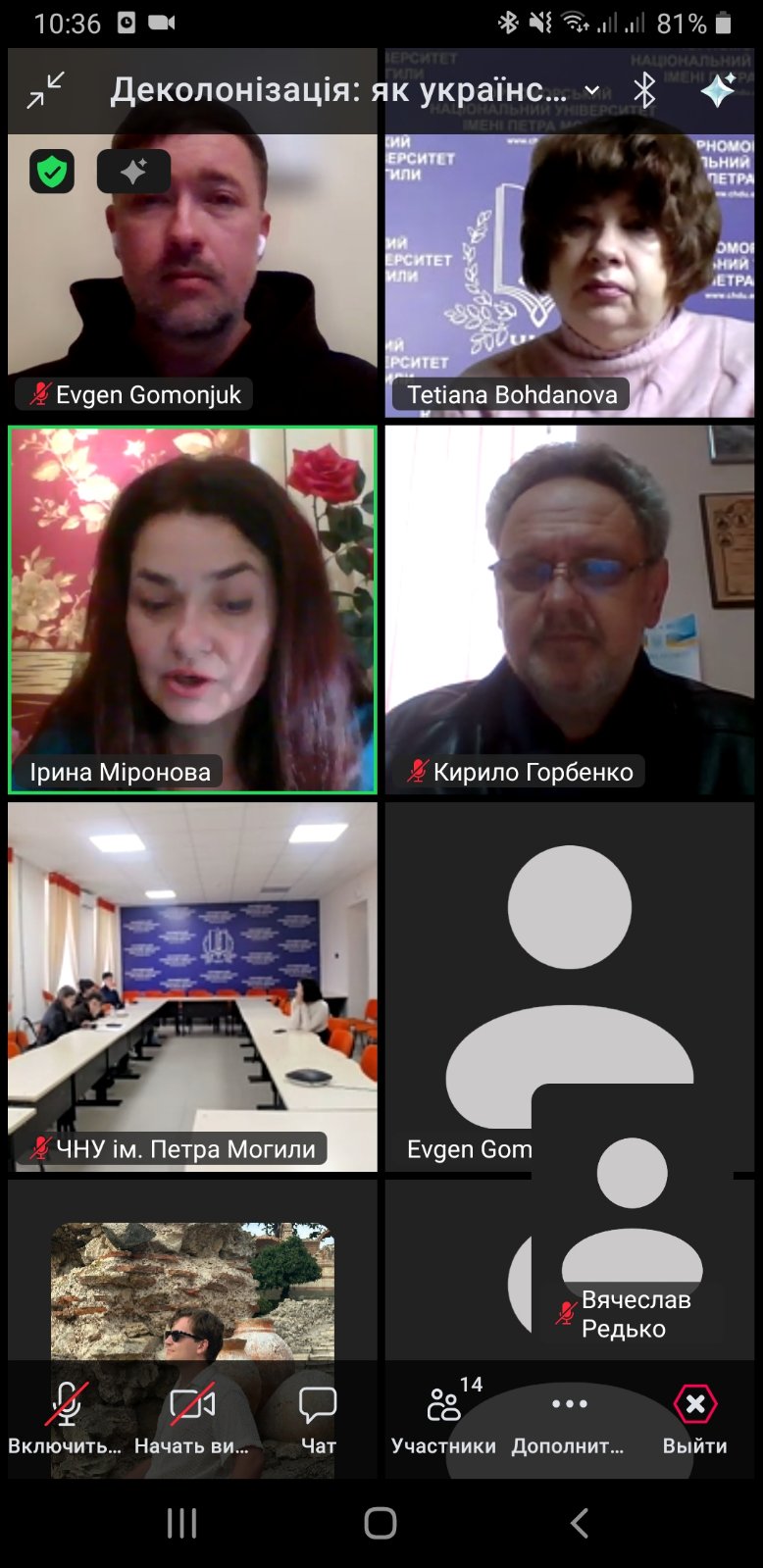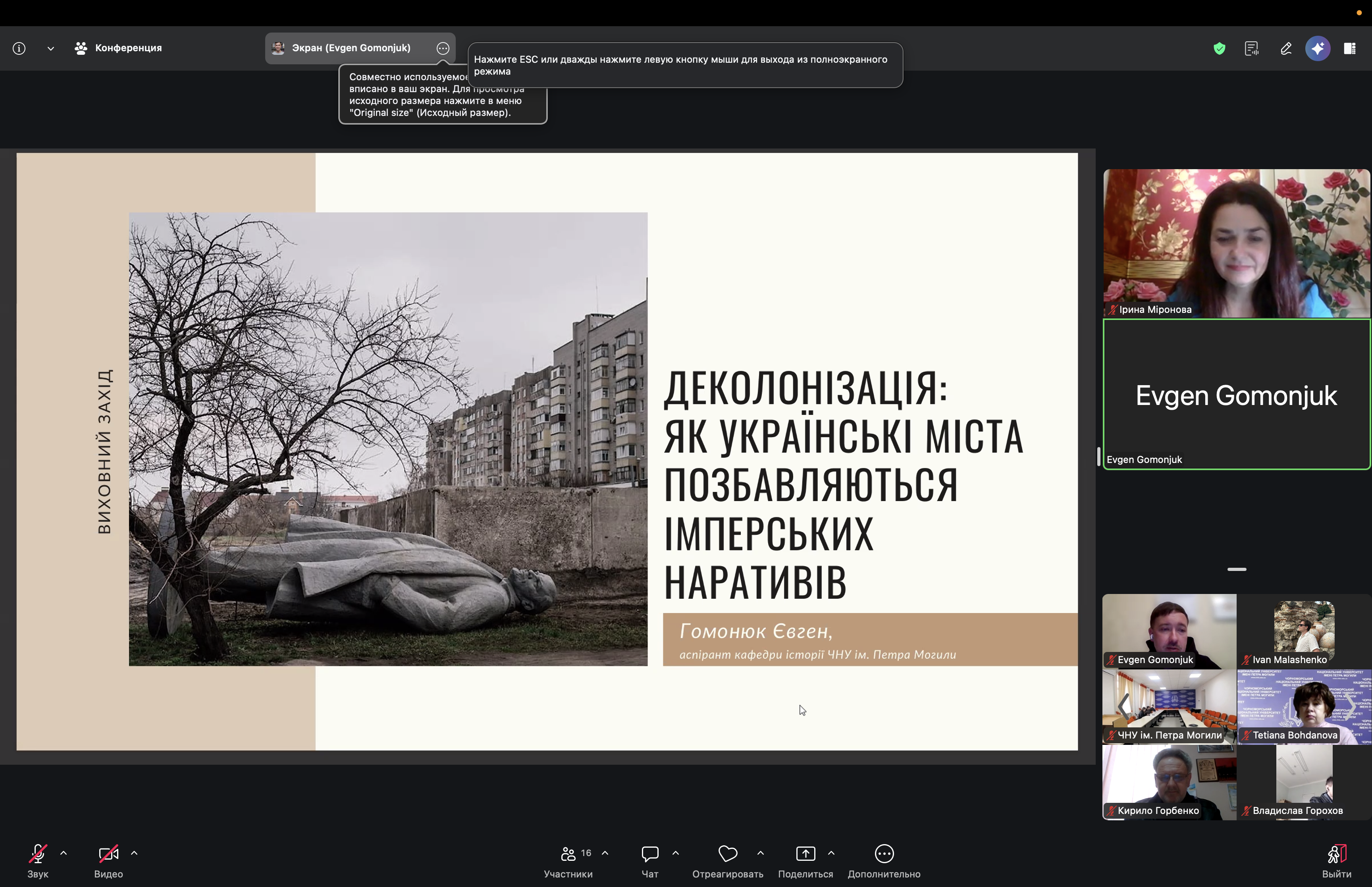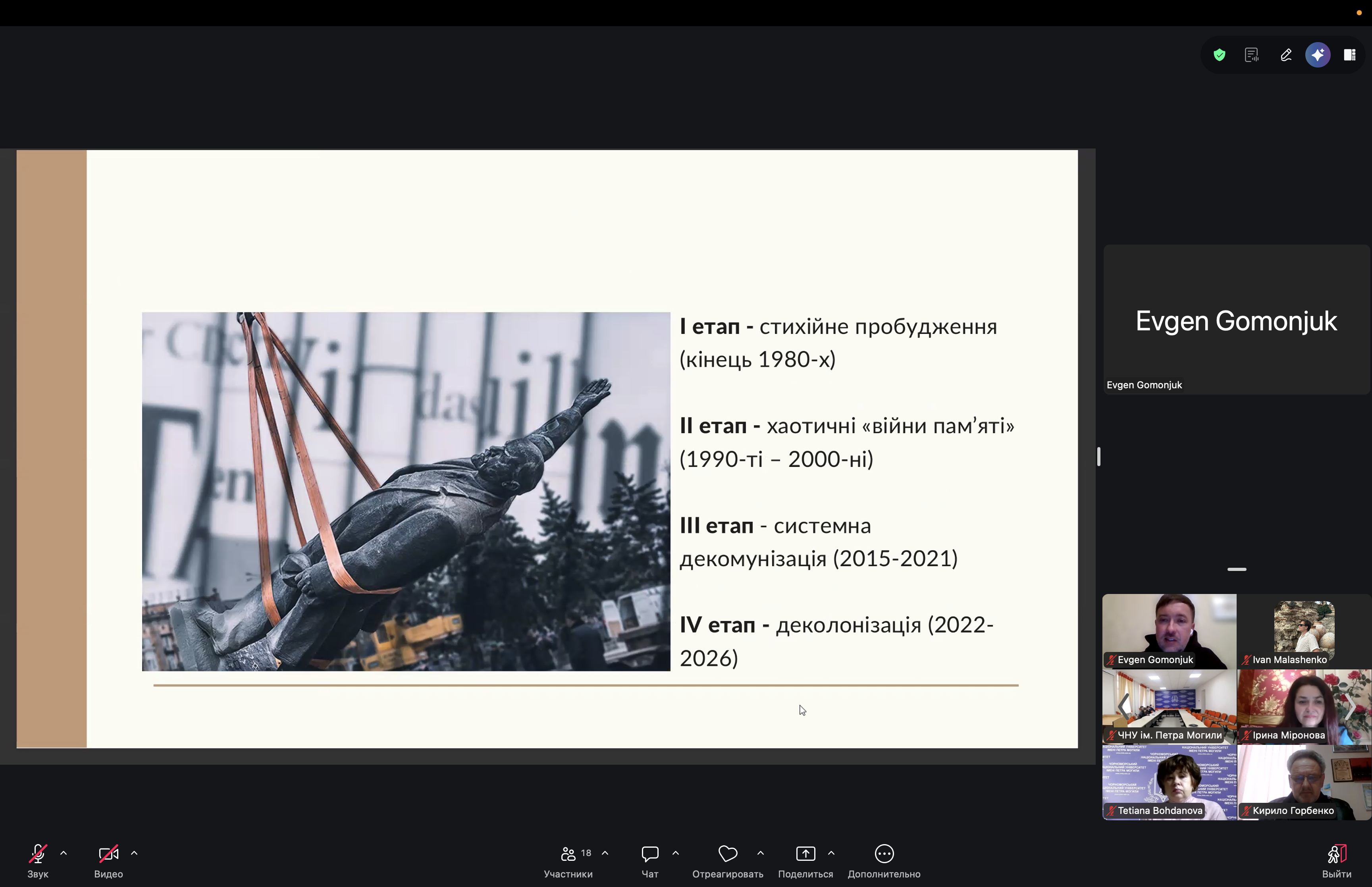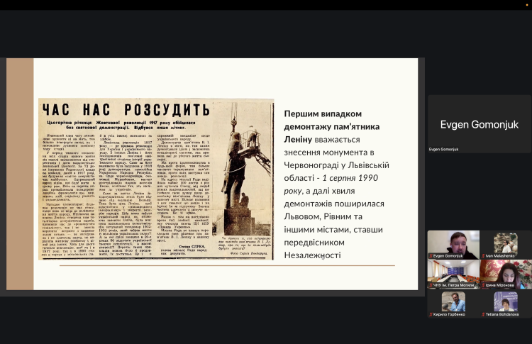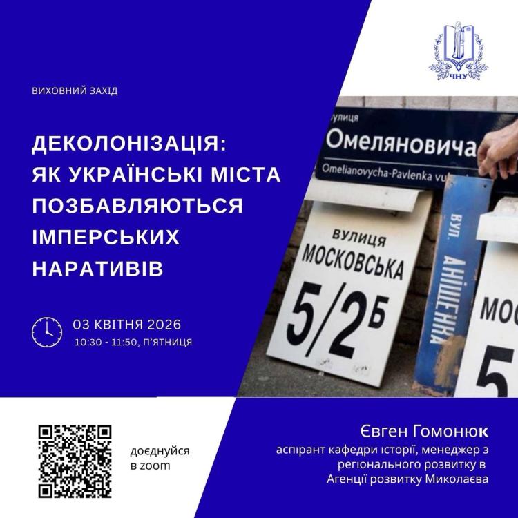 3 квітня о 10:30 відбувся виховний захід у форматі Zoom на тему «Деколонізація: як українські міста позбавляються імперських наративів». Лекцію прочитав Євген ГОМОНЮК – аспірант кафедри історії Чорноморського національного університету імені Петра Могили, співзасновник Платформи MY ART та менеджер з регіонального розвитку в Агенції розвитку Миколаєва.