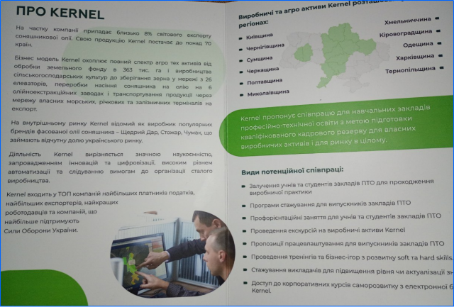 На нещодавньому Дні Кар'єри, що відбувся 19 лютого 2024 року, аграрний сектор представила компанія Kernel, що є найбільшим в Україні виробником та експортером соняшникової олії, а також ключовим постачальником сільськогосподарської продукції на світовий ринок. Вона презентувала кар’єрні можливості для студентів, адже компанія пропонує широкий їх спектр у різних напрямках, від агрономії та інженерії до фінансів та маркетингу.