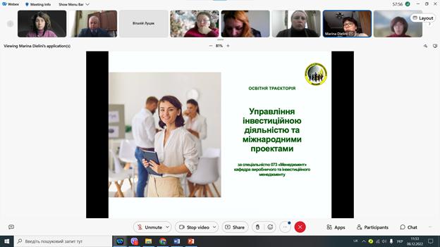 Цікавою та інформативною була презентація виконувача обов’язків кафедри виробничого та інвестиційного менеджменту, доктора економічних наук, професора Марини Дєліні, яка розповіла про набуття фаху проектного менеджера на освітній траєкторії кафедри, яку вона очолює. Марина Дєліні зазначила, що набуття освіти студентами є вже саме по собі інвестицією у майбутнє, а життя кожного з нас є, в якійсь мірі, проектом. Студенти, які вивчають проектний менеджменту, уже під час навчання мають можливість розробляти свої проекти та брати участь у конкурсі проектів «Від ідеї до успіху», що безперечно дає їм певний імпульс для подальшої кар’єри.