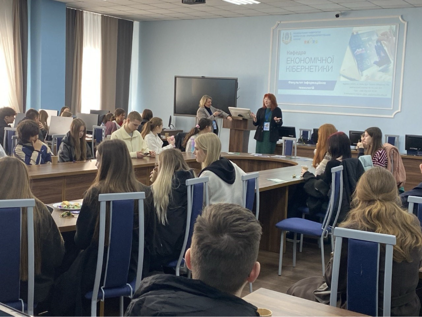 Після екскурсії учні ліцею 309 мали нагоду повернутися до аудиторії, де більш детально ознайомилися зі спеціальністю С1 «Економіка та міжнародні відносини», зокрема з освітніми програмами «Економічна кібернетика» та «Цифрова економіка», які реалізуються на базі факультету інформаційних технологій (деталі: