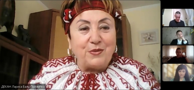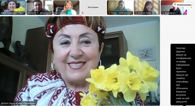 До бесіди підключилася доцент Юлія Крижова, яка доповнила інформацію про вступ на наш факультет, про вибір спеціальностей, про великі можливості навчання на факультеті та запросила всіх вступати на наш факультет і сказала, що вони вже зробили свій правильний вибір, приймаючи участь у нашому спільному заході.