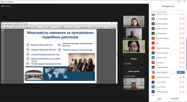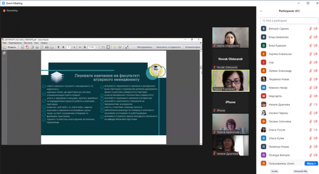 Завідувач кафедри не залишила без уваги й переваги організації навчального процесу в університеті загалом і на кафедрі, зокрема, як в умовах звичайного аудиторного навчання, так і дистанційної роботи. Жодна лекція не проходить без презентаційного супроводу (аудиторії обладнані сучасною технікою), а в умовах військового стану дуже важливим для всіх учасників освітнього процесу є забезпеченість всіх дисциплін електронними навчальними курсами. Також під час зустрічі вона розповіла про проведення занять за участю запрошених вітчизняних науковців та практиків, співпрацю з іноземними партнерами, виховну роботу, яка проводиться наставниками академічних груп. Особливу увагу було зосереджено на тому, що навчання на факультеті аграрного менеджменту повною мірою відповідає вимогам до забезпечення набуття здобувачами вищої освіти необхідних компетентностей сучасного менеджера.