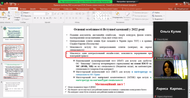Вичерпну інформацію про особливості вступної кампанії 2022 р. презентувала заступник відповідального секретаря приймальної комісії НУБіП України Кривов’яз Євгенія Вікторівна. Вона розповіла як буде здійснюватись подання документів для вступу в сучасних умовах, з яких предметів складається мультипредметний тест, як написати ефективний мотиваційний лист, які існують можливості вступу без централізованих іспитів та інші особливості цьогорічної вступної кампанії.