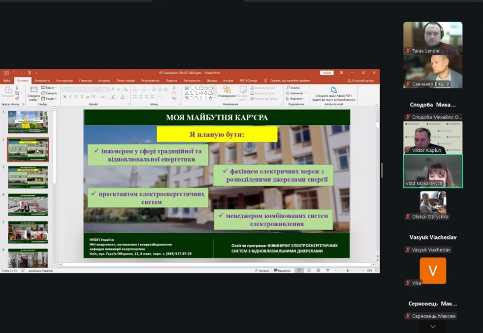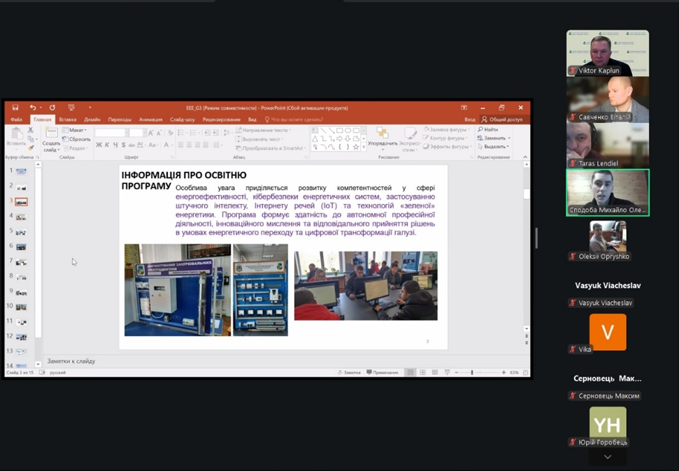 У ході виступу було окреслено мету програми та ключові навчальні дисципліни, що поєднують класичні підходи електроенергетики з сучасними інженерними рішеннями. Особливу увагу приділено вивченню відновлюваних джерел енергії – сонячної та вітрової, а також проєктуванню сучасних енергосистем, орієнтованих на стійкість, ефективність і вимоги сьогодення.