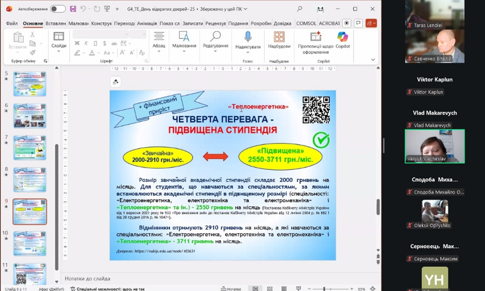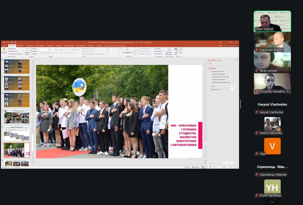 Онлайн День відкритих дверей став важливим етапом профорієнтаційної діяльності ННІ енергетики, автоматики і енергозбереження, надавши абітурієнтам та їхнім батькам комплексну інформацію про освітні програми, умови навчання й професійні перспективи. Загалом, з урахуванням групових підключень, у заході взяли участь понад 40 осіб, що свідчить про інтерес до інженерних спеціальностей інституту.
