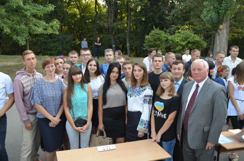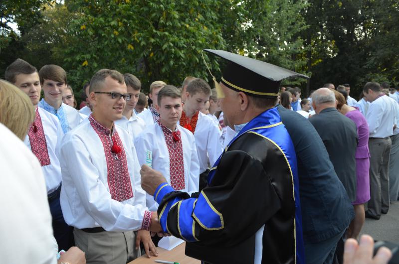 І ось настала мить посвяти. Студенти 9-ти нових академічних груп із рук своїх кураторів і представників кафедр отримали студентські квитки, проголосили ПРИСЯГУ СТУДЕНТА. По завершенню колона першокурсників, студентів і викладачів на чолі з деканом рушила на стадіон, для участі в загальноуніверситетському святкуванні Дня знань та урочистій Посвяті у студенти.