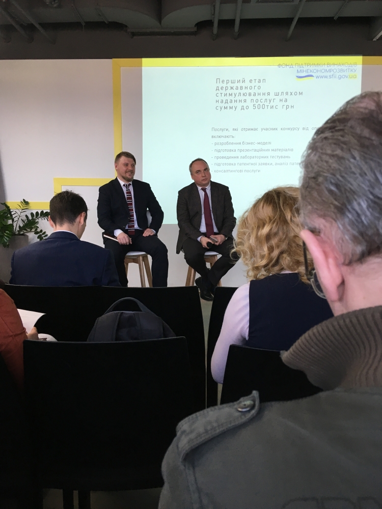 Захід відкрив вітальним словом Заступник Міністра економічного розвитку і торгівлі України Юрій Бровченко зазначивши, що Фонд підтримки винаходів Мінекономрозвитку є експерементальний проект який передбачає на конкурсних засадах відбір стартапів/проектів для державного стимулювання.