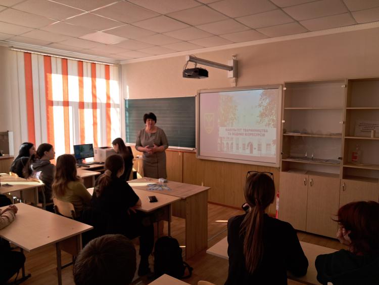 Захід відбувся з метою ознайомлення учнів із сучасними можливостями здобуття вищої освіти у провідному закладі – НУБіП України. Під час зустрічі Тетяна АНТОНЮК розповіла про освітні програми факультету тваринництва та водних біоресурсів, зокрема: Н2 «Тваринництво» за двома освітніми програмами «Технологія виробництва і переробки продукції тваринництва», «Кінологія» та Н5 «Водні біоресурси та аквакультура».