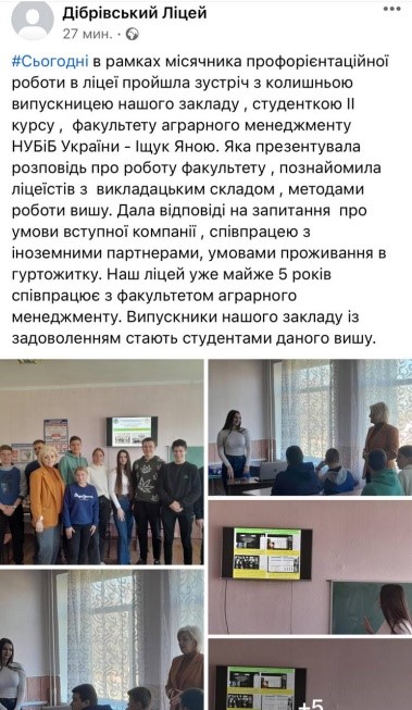 З метою популяризації НУБіП України та факультету аграрного менеджменту зокрема, 27 березня Наталія Відрук відвідала Старокостянтинівську загальноосвітню школу №1, 29 березня Вікторія Сіденко провела профорієнтаційну роботу у Шепетівській спеціалізованій загальноосвітній школі І-ІІІ ступенів №2 з поглибленим вивченням основ економіки і правознавства, що на Хмельниччині, а 30 березня Яна Іщук завітала до Дібрівського ліцею Київської області.