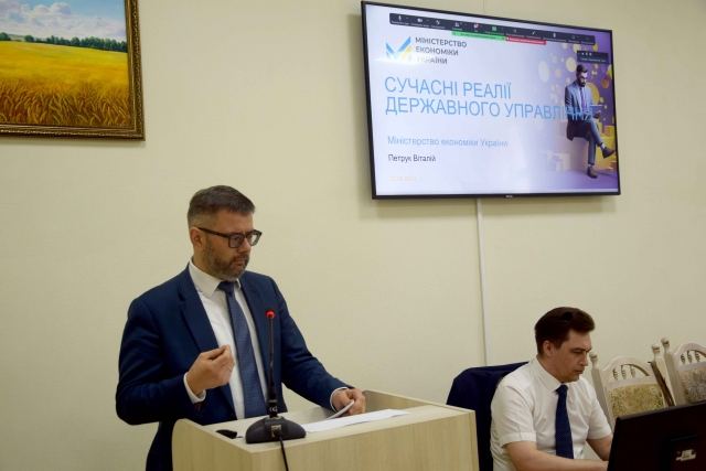 Державний секретар Міністерства економіки України Віталій Вікторович Петрук під час ґрунтовної доповіді на тему «Сучасні реалії державного управління в органах виконавчої влади (на прикладі Мінекономіки)» ознайомив учасників науково-практичної конференції про основні пріоритети державного управління, які пов’язані з оптимізацією робочих процесів через формування Центру уряду, реформою системи оплати праці державних службовців, впровадженням кращих практик менеджменту та проєктного управління.
