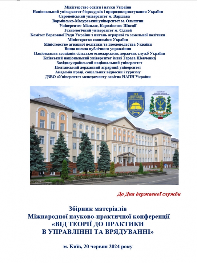 Кафедра публічного управління, менеджменту інноваційної діяльності та дорадництва ННІ неперервної освіти та туризму завершила 2023-2024 н.р. проведенням Міжнародної науково-практичної конференції «Від теорії до практики в управлінні та врядуванні». Захід організований з нагоди Дня державної служби, в якому взяли участь вітчизняні та зарубіжні науковці-колеги, члени Ради роботодавців ННІ неперервної освіти і туризму, практики-державотворці, представники органів публічної влади та громадських організацій, провідні вчені та здобувачі вищої освіти.