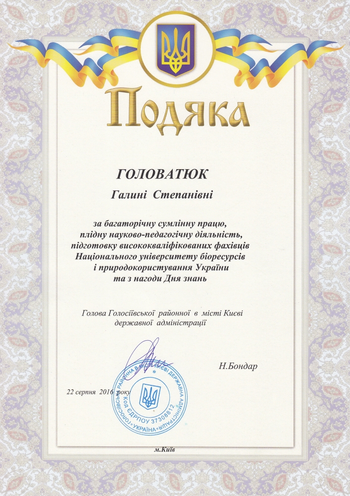 Подякою Голосіївської районної в м. Києві державної адміністрації відзначено старшого лаборанта кафедри стандартизації та сертифікації сільськогосподарської продукції Галину Головатюк.