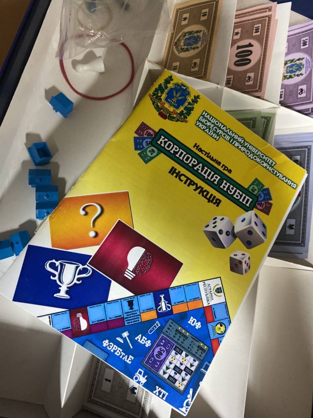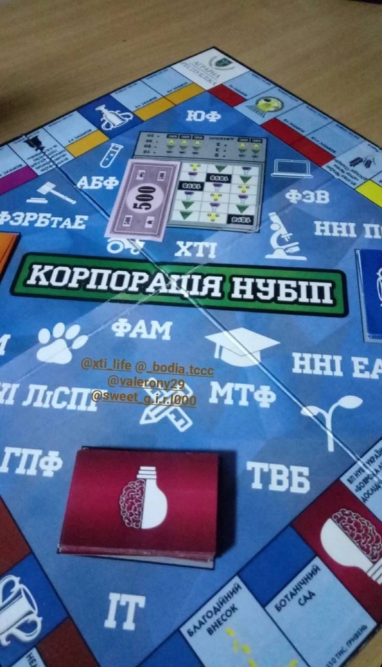 Розробниками настільної гри – «Корпорація НУБіП» є випускник нашого факультету Олександр Павелко і його колега з факультету захисту рослин, біотехнологій та екології Максим Гречанюк, і на постійній основі з того часу проводяться турніри серед студентства університету. Гра спроектована за мотивами усім відомої монополії під назвою «Корпорація НУБіП». Університетська гра стала справжнім переворотом у свідомості студентів, працівників і загалом усієї нашої університетської сім’ї. До участі в турнірі долучаються студенти усіх факультетів та ННІ.
