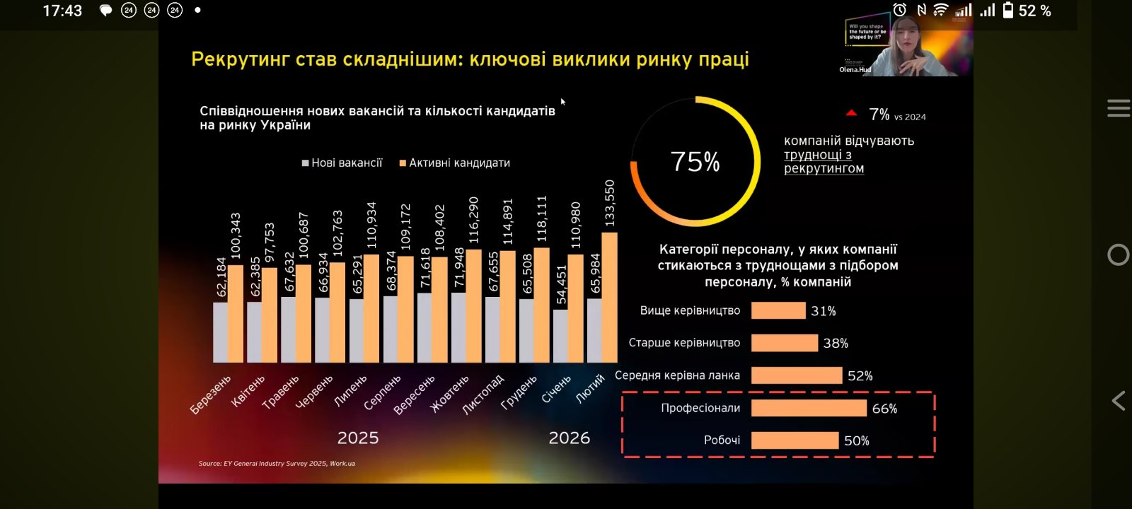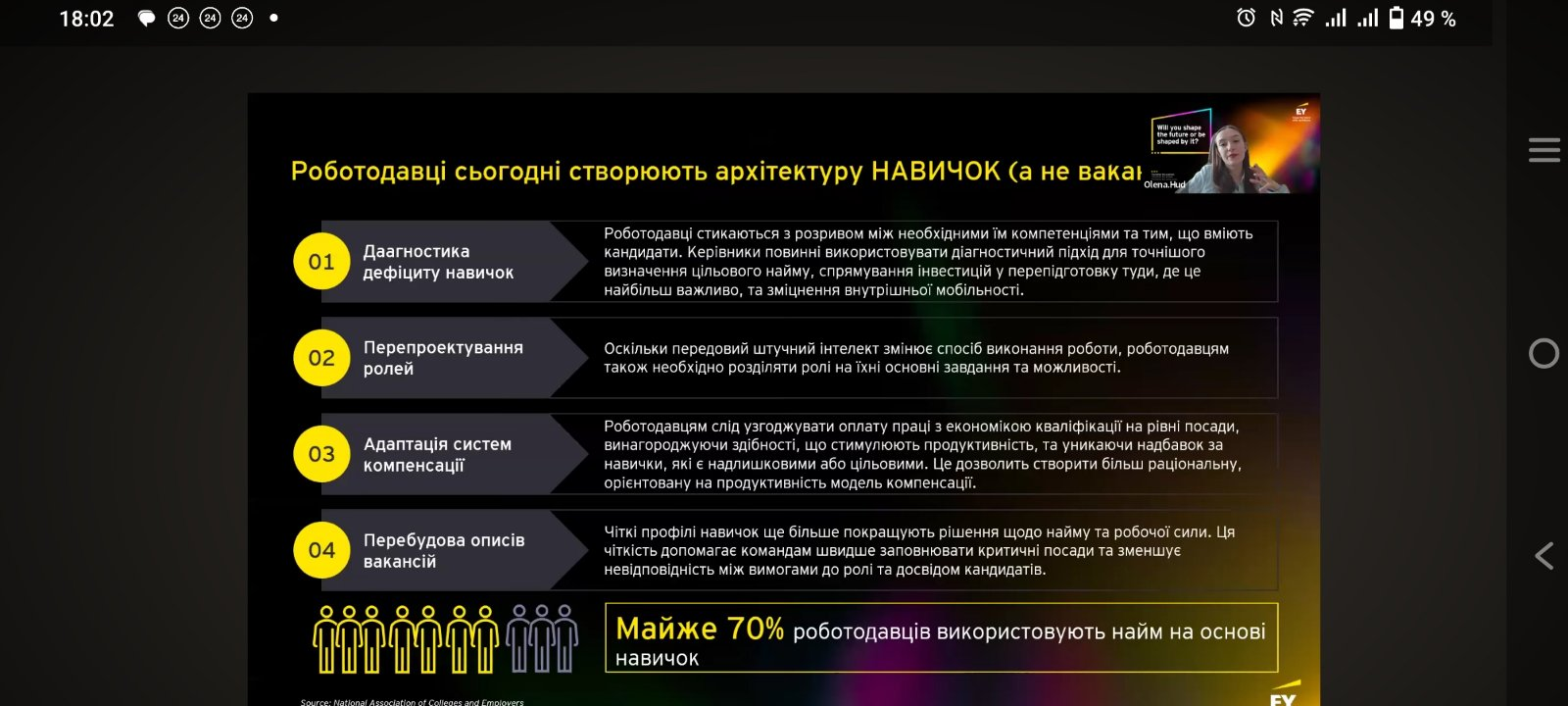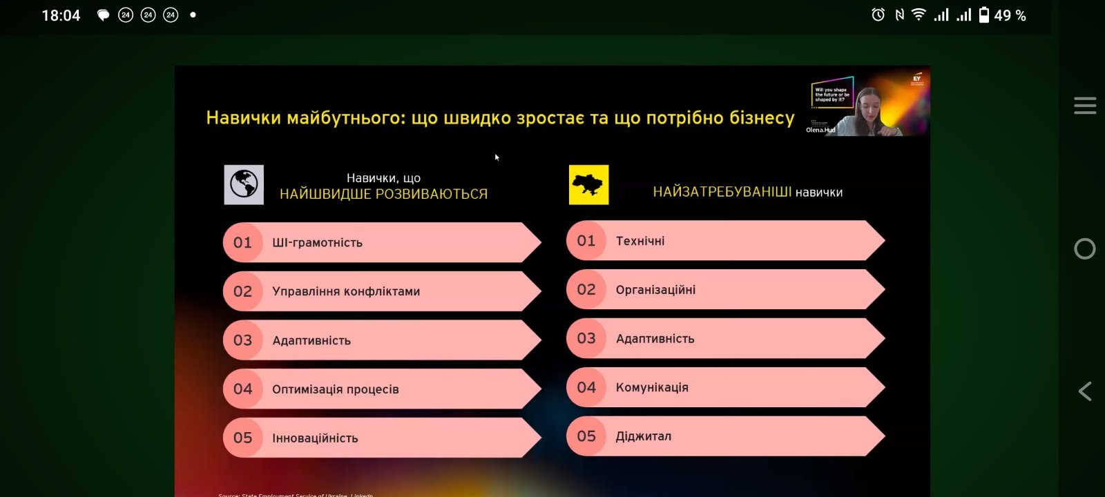 Цікавими були факти про ключові виклики на ринку праці, які утруднюють з однієї сторони, підбір компаніями висококваліфікованих спеціалістів, а з іншої - пошук роботи для випускників університету.
