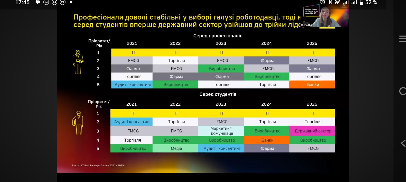 Фахівці компанії EY дослідили також сектори економіки, які є пріритетними як для студентів, так і для вже сформованих професіоналів.