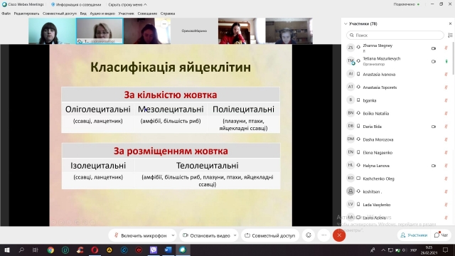 Тетяна Анатоліївна виклада метеріал лекції, в якому були розкриті питання життєдіяльності клітин, що включають обмін речовин, подразливість, чутливість, мінливість, адаптацію, ріст, старіння, смерть, а також репродукцію клітин – мітоз, амітоз, мейоз. Також на лекції були розглянуті питання будови і функцій сперматозоїдів і яйцеклітин, класифікації яйцеклітин, особливості будови яйцеклітин (яйця) птахів.