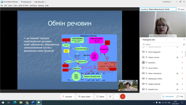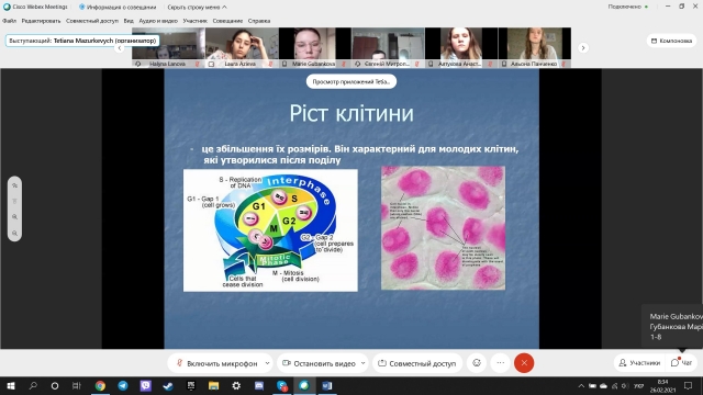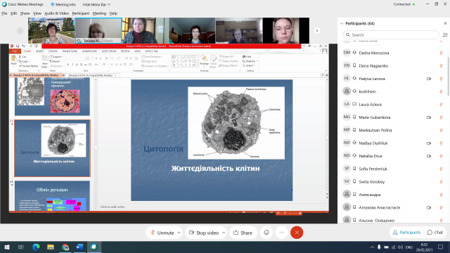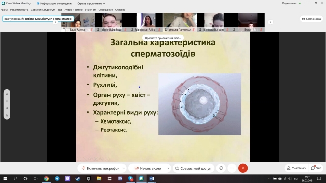 Лекція на тему «Життєдіяльність клітин. Будова і функції статевих клітин» була прочитана доцентом Т. А. Мазуркевич в online-режимі студентам 6–9 груп 1 курсу факультету ветеринарної медицини. Явка студентів на лекції становила близько 90 %.