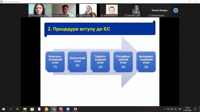 Друга частина заняття була присвячена процедурі вступу країни до ЄС. Презентувавши і детально розкривши сутність кожного із п’яти основних етапів даного процесу, лектор наголосив на тому, що Україна й досі перебуває на першому з них, тоді як Туреччина і ряд Балканських країн ведуть активні переговори щодо членства у ЄС.