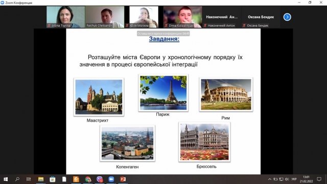 Наприкінці відкритої лекції Олександр Файчук з метою повторення студентами пройденого матеріалу провів коротку ділову гру, в якій слухачам потрібно було правильно у хронологічному порядку розставити міста Європи у відповідності до їх ролі у процесі становлення Європейського Союзу. З цим завданням третьокурсники справились без проблем.