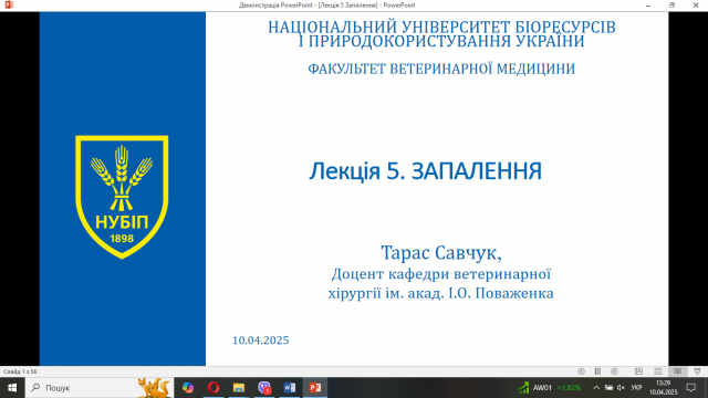 У четвер, 10 квітня 2025 року, на 3 парі доцент кафедри ветеринарної хірургії ім. акад. І.О. Поваженка Савчук Тарас Любомирович прочитав відкриту лекцію з дисципліни «Патофізіологія тварин» для студентів 3 курсу 9-10 грпи СК ОС «Магістр» спеціальності 211 «Ветеринарна медицина» на тему «Запалення».