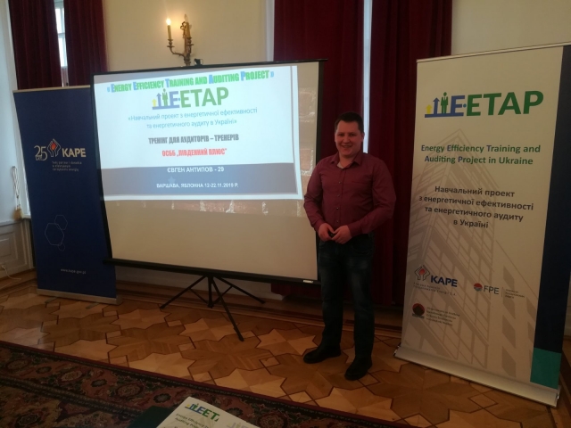 В рамках реалізації проекту Національного агентства з питань енергозбереження Республіки Польща (Krajowa Agencja Poszanowania Energii S.A. - KAPE) та Фонду збереження енергії (Fundacja Poszanowania Energii - FPE), щодо надання технічної допомоги Україні під назвою: „E-ETAP” - Навчальний проект з енергетичної ефективності та енергетичного аудиту в Україні), доцент кафедри теплоенергетики, к.т.н. Євген Антипов пройшов навчання в рамах курсу «Тренуй тренера» (далі Т-t-Т) та став атестованим тренером проекту E-ETAP! Навчальний проект з енергетичної ефективності та енергетичного аудиту в Україні Е-ЕТАР є результатом прийняття Законів України «Про енергетичну ефективність будівель», «Про Фонд енергоефективності» та проводиться в рамах проекту технічної підтримки Фонду енергоефективності в Україні, яка надається польським урядом задля покращення енергетичної ефективності в Україні. Проект „E-ETAP” реалізовується у співпраці з Німецькою федеральною компанією Deutsche Gesellschaft für Internationale Zusammenarbeit GmbH (GIZ) i був схвалений Міністерством регіонального розвитку, будівництва, житлово-комунального господарства України (МІНРЕГІОН) на початку 2019 року. Метою проекту E-ETAP є підвищення професійної кваліфікації енергетичних аудиторів в Україні в сфері енергоаудиту багатоквартирних будинків, що дозволить: • проводити енергетичні аудити та техніко-економічні оцінки інвестицій в термомодернізацію будівель (енергетичний аудит з повним обсягом термомодернізації); • видавати енергетичні сертифікати будинків відповідно до чинного законодавства України; • підтримувати ОСББ під час приготування та складання необхідних документів до Фонду енергоефективності України. Отже, 9 грудня 2019 року в Яблонні поблизу Варшави, у палаці XVII століття, що належить Польській академії наук, розпочалась підготовка другої групи українських фахівців з енергетичного аудиту до складу якої потрапив і автор статті. У навчанні взяли участь двадцять досвідчених аудиторів з будівельної галузі із 9 областей України, які готуються до ролі викладачів з енергоаудиту.