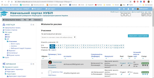 Завідувач кафедри Ольга Бойко і доцент кафедри Андрій Бабицький забезпечують дистанційне навчання студентів 2 курсу спеціальності «Захист і карантин рослин», студентів 3 курсу спеціальності «Біотехнологія і біоінженерія» факультету захисту рослин, біотехнологій та екології та студентів 1 курсу спеціальності «Садівництво і виноградарство» агробіологічного факультету з дисципліни «Фізіологія рослин» через електронний курс на порталі університету – https://elearn.nubip.edu.ua/course/view.php?id=1118.