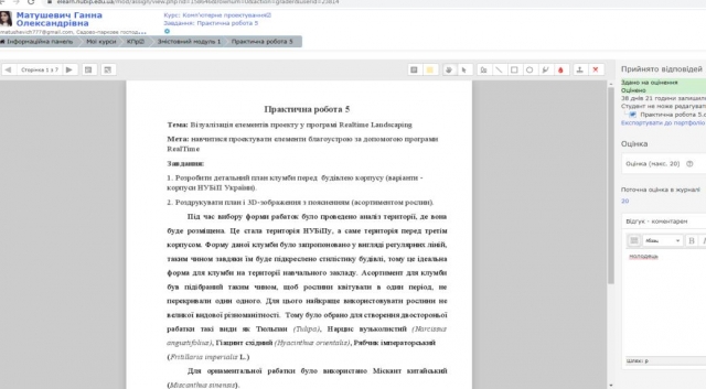 З дисципліни «Комп’ютерне проектування» доцент кафедри ландшафтної архітектури та фітодизайну Ольга Зібцева зауважила, що заняття відбуваються за звичним графіком: як лекційні, так і практичні через системи дистанційного навчання elearn. У відповідності з навчальним планом, студенти завершують роботу над 1 модулем. На жаль, з модулем справилися ще не всі студенти, але сподіваємося, що до визначеного часу високого результату досягнуть усі.