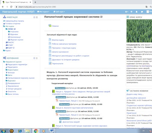 В умовах сьогодення згідно Закону України «Про внесення змін до деяких законодавчих актів України, спрямованих на запобігання виникнення і поширення коронавірусної хвороби (COVID-19)», студенти ОС «Бакалавр» та «Магістр», факультету захисту рослин, біотехнологій та екології, спеціальності 202-Захист і карантин рослин дистанційно опановують навчальні дисципліни на кафедрі фітопатології ім. акад. В Ф. Пересипкіна. З цією метою вивчення теоретичного матеріалу, підготовку лабораторних і самостійних робіт вони здійснюють за допомогою електронних навчальних курсів на платформі «Elearn» https://elearn.nubip.edu.ua.