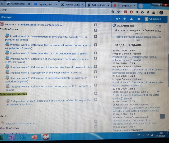 Дистанційне навчання з дисципліни «Системний аналіз якості навколишнього середовища» (https://elearn.nubip.edu.ua/course/view.php?id=2687) для студентів I року навчання ОС «Магістр» спеціальності 101 Екологія (Екологічний контроль та аудит) проводять доцент кафедри Сергій Грисюк та завідувачка кафедри Алла Клепко. За період з 12.03.2020р. по 23.03.2020р. студенти опрацювали матеріал по лекції 4 «Модель системи та методи моделювання» та лекції 5 «Сценарії розвитку екологічної ситуації та механізми покращення стану довкілля».