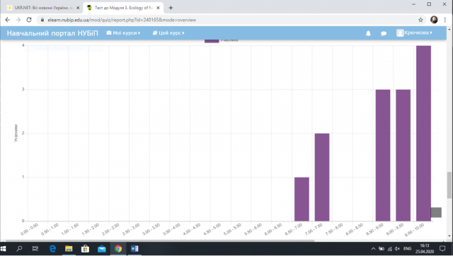 У курсі «Загальна мікологія», який проходять студенти 2-го року навчання, розміщено лекції №№ 15-21 з відповідними презентаціями, методичні рекомендації до виконання лабораторних робіт №№11-16 та завдання до лабораторних робіт №№15 і 16 з теми «Ecology of Fungi». Станом на 3 квітня студентами було виконано 85% завдань, а 13 квітня студенти дистанційно складали тестовий модуль. За результатами оцінювання, представленими на гістограмі, можна зробити висновок, що успішність студентів є досить високою. Із тринадцяти студентів сім (53%) виконали тестовий модуль з оцінкою «відмінно», три – з оцінкою «добре» і лише три з оцінкою «задовільно».