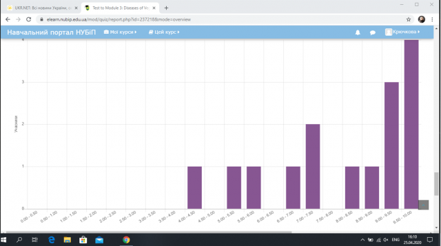 Для студентів 4-го року навчання у курсі «Сільськогосподарська фітопатологія» розміщено лекції №№ 10-15 з відповідними презентаціями та методичні рекомендації до виконання лабораторних робіт №№11-16, а також завдання до робіт №№15 і 16 з теми «Diseases of Vegetables». Більшість студентів виконали завдання. Зокрема, відмінні оцінки отримали Крикуненко Світлана та Галушка Анастасія. Окремі студенти завдання не виконали, тому позначені як відсутні на даних заняттях. Тестовий модуль студенти складали 7 квітня. Найвищу оцінку отримало 7 студентів, «добре» - 3, решта - оцінку «задовільно».