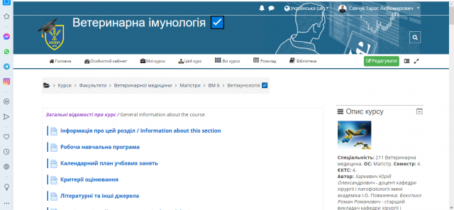 Також, студенти використовують електронний навчальний курс дисципліни «Ветеринарна імунологія», який розміщений на платформі Elearn (https://elearn.nubip.edu.ua/enrol/index.php?id=434).
